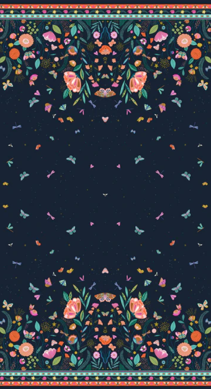 Beautiful double border print featuring flowers, butterflies, bees and dragonflies on a dark blue background from the Flutter By collection.