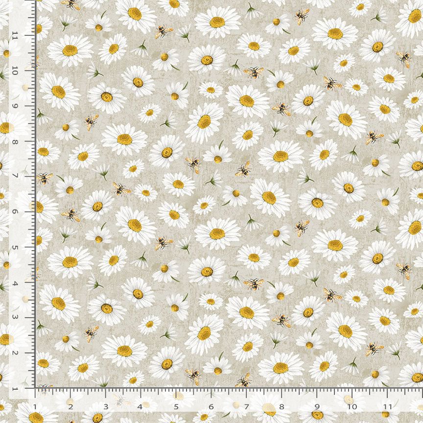Daisies and bees tossed on a light gray/tan background from the Honey Bee Farm collection.