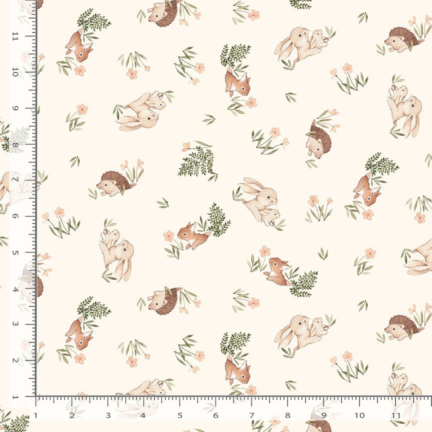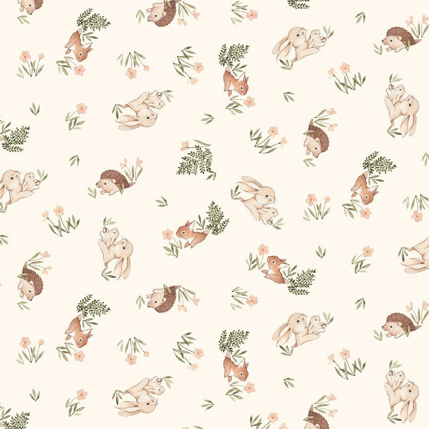 Sweet woodland print with bunnies and hedgehogs on a cream background from the Little Forest collection.