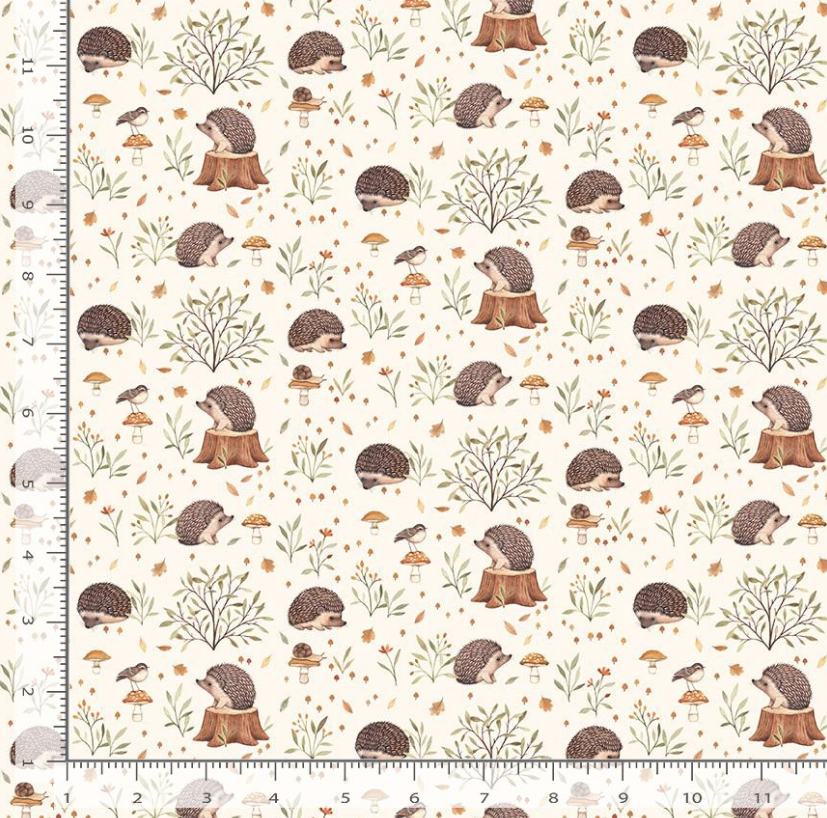 Sweet little hedgehogs, mushrooms and bushes on a cream background from the Little Forest collection.