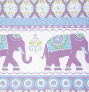 Very cute large scale boho fabric with purple elephants on a white background from the Sundara Oasis collection.