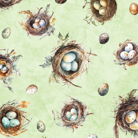 Beautiful print with birds' nests and eggs on a mint green background from the Birdsong collection.