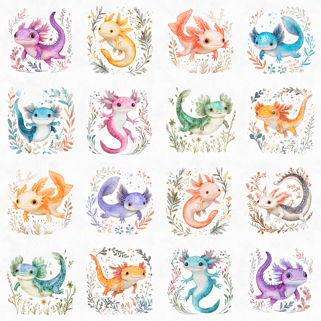 Adorable print with axolotls on a white background from the QT Cuties 2 collection. Each vignette is approx 3.5" square.
