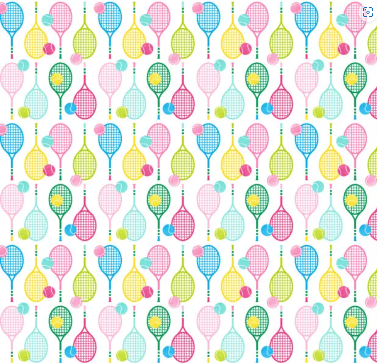 Pink, green, blue and yellow tennis print with rackets and balls on a white background from the Court & Club collection.