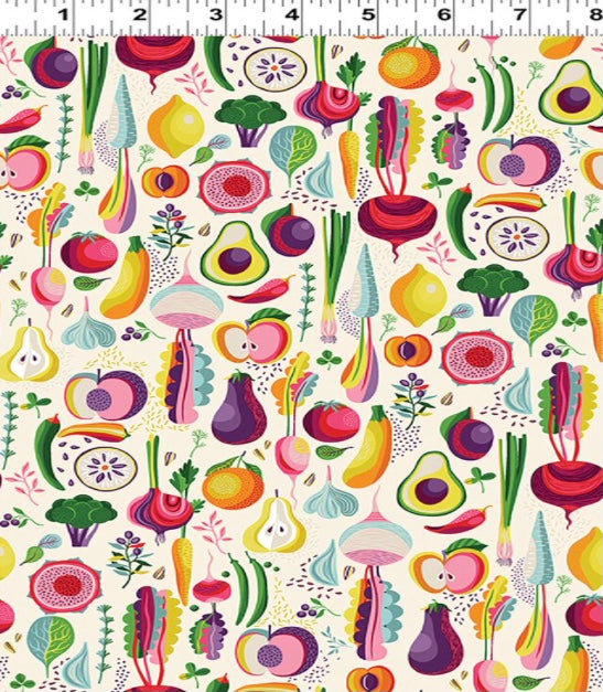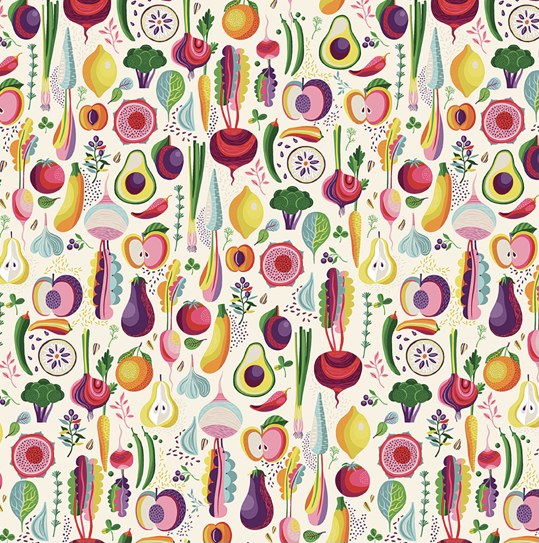 Vibrant fruit & vegetable print on a cream background from the Floribunda collection. Features eggplant, avocado, lemons, carrots, radishes, peaches and more.