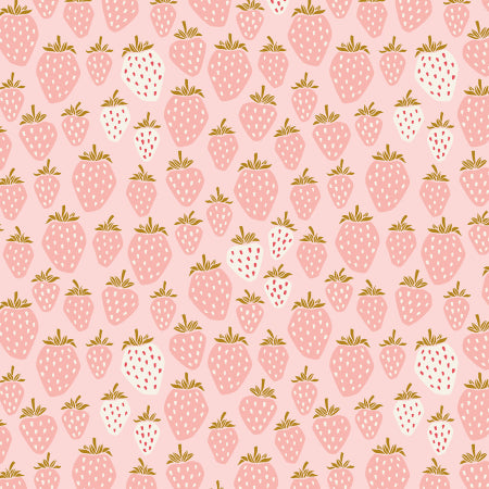 Adorable print with artistic strawberries on a pink background from the Under the Apple Tree collection.
