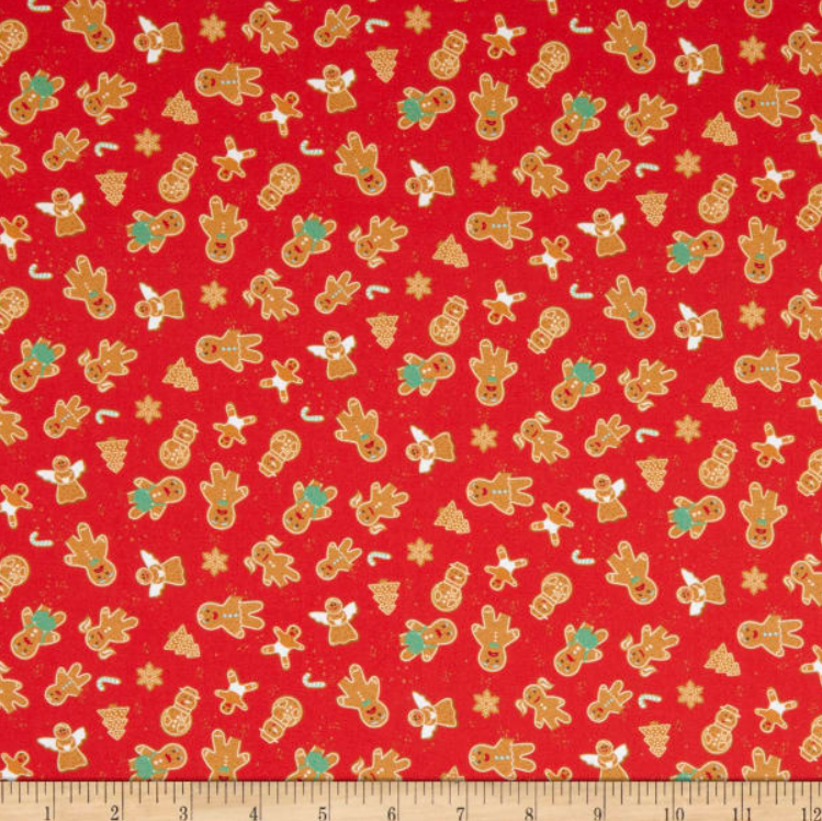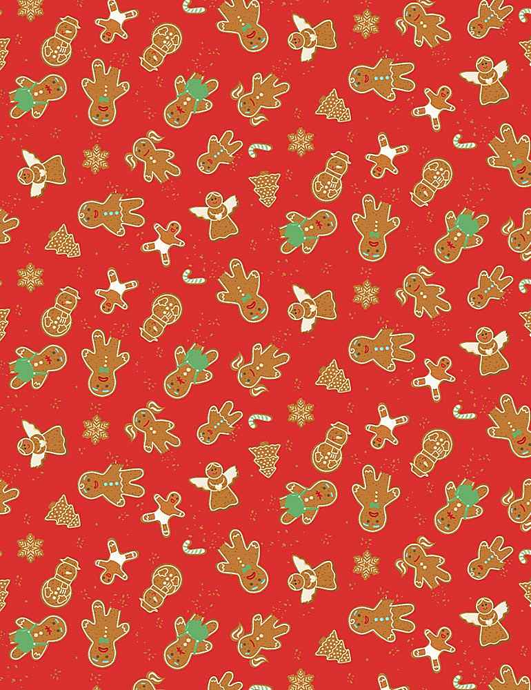 Whimsical Christmas print with small-scale gingerbread cookies on a red background from the Naughty & I Gnome It collection.