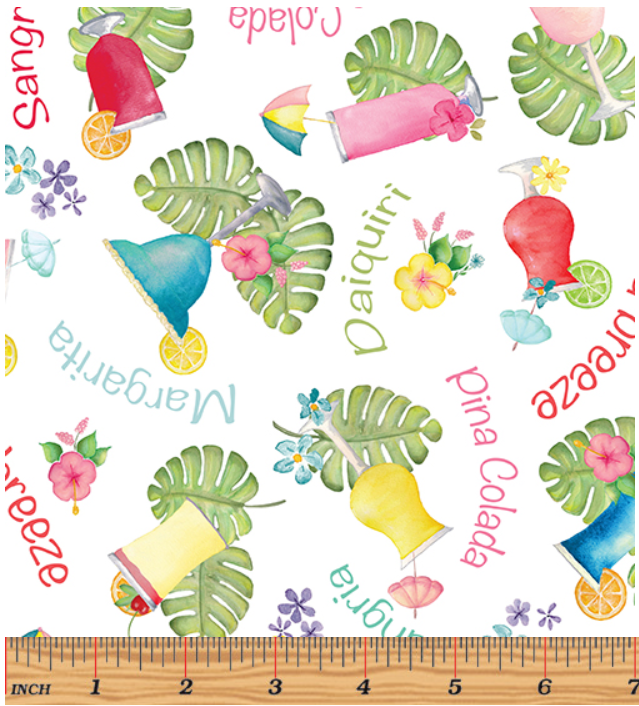 Daiquiris, Mai Tais and other mixed drinks with monstera leaves on a white background from the Fun in the Sun collection.