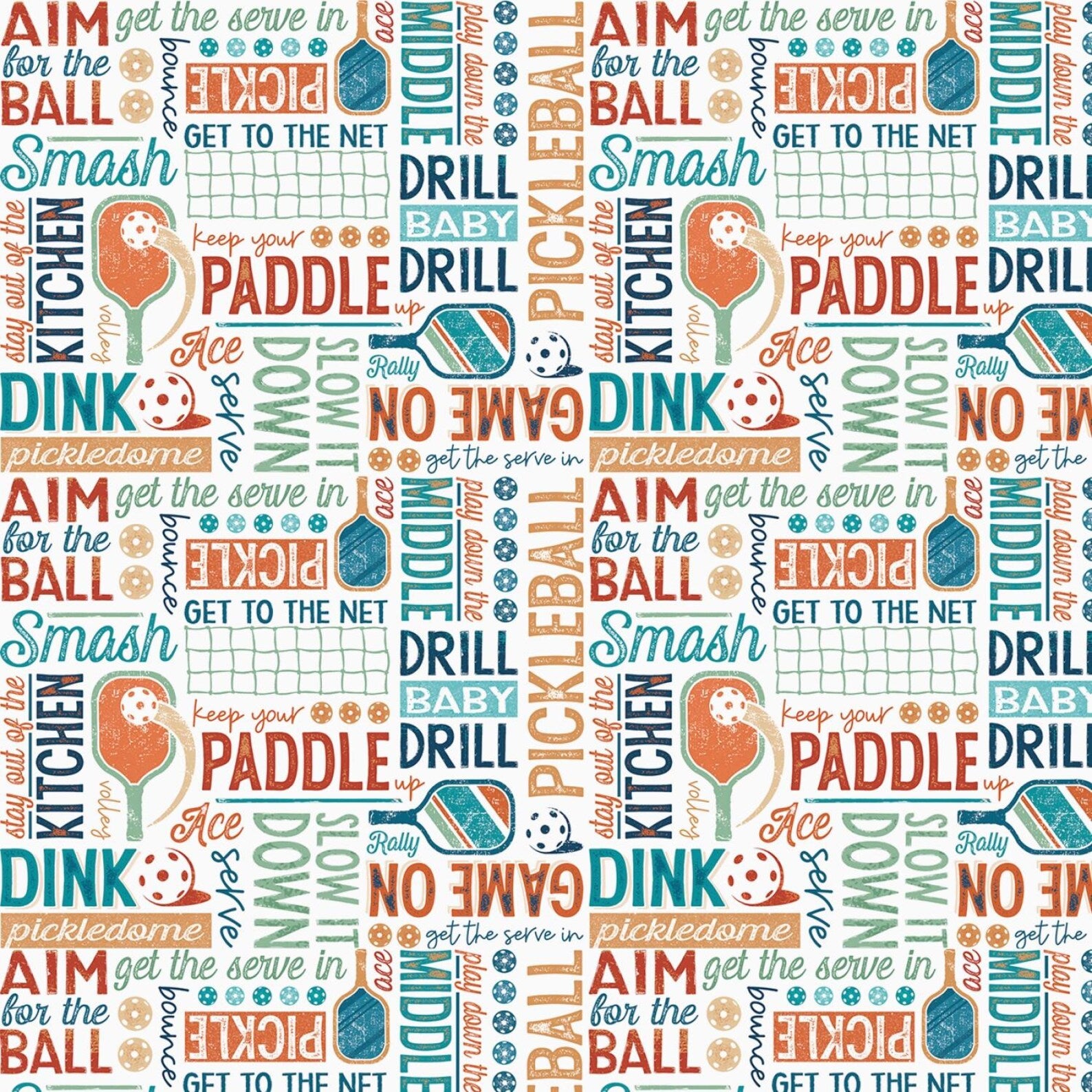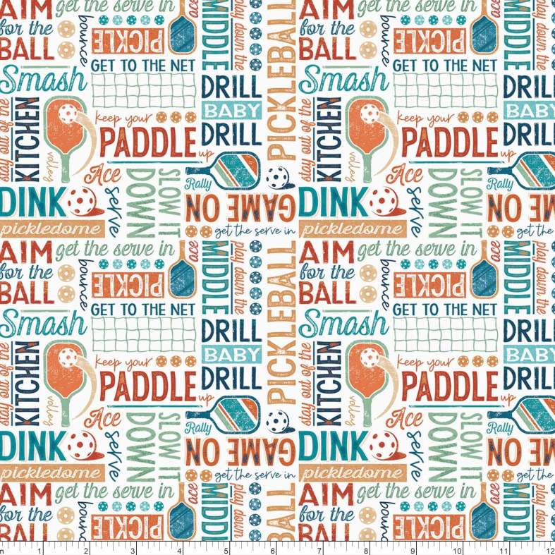 Fun sports print with pickleball words and icons on a white background from the Pickleball Champ collection.
