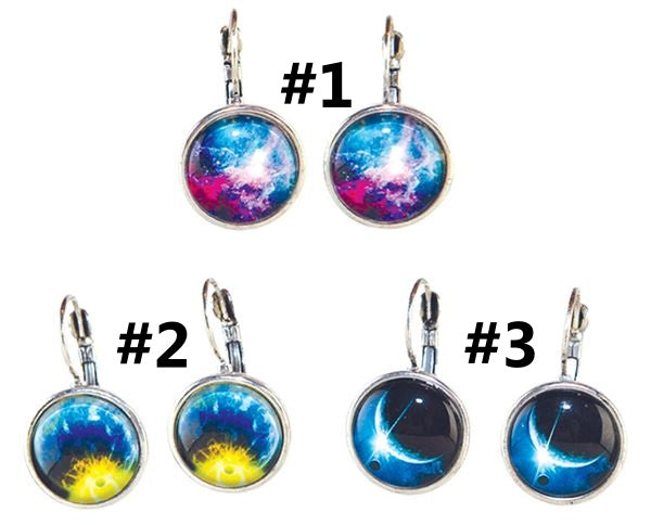 Cool galaxy themed earrings. Silver colored lever back. Choose from three designs.