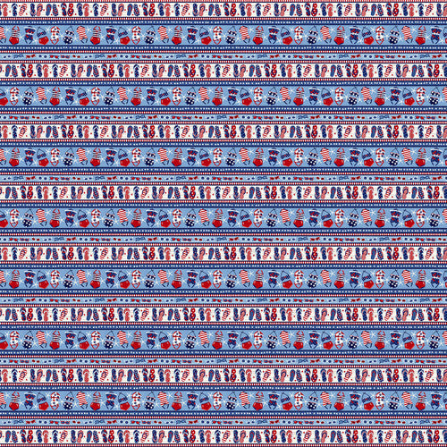 Patriotic summer border stripe featuring flip flops, bathing suits, sunglasses and more in red, white and blue from the Star-Spangled Beach collection.