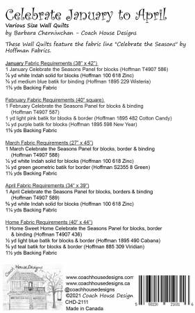 Five patterns included to coordinate with the Celebrate the Seasons line. Instructions for 4 monthly wall hangings (January to April) and 1 Home Sweet Home wall hanging of various sizes. Pattern features Celebrate the Seasons Panels and coordinates by Hoffman Fabrics (available for purchase separately).