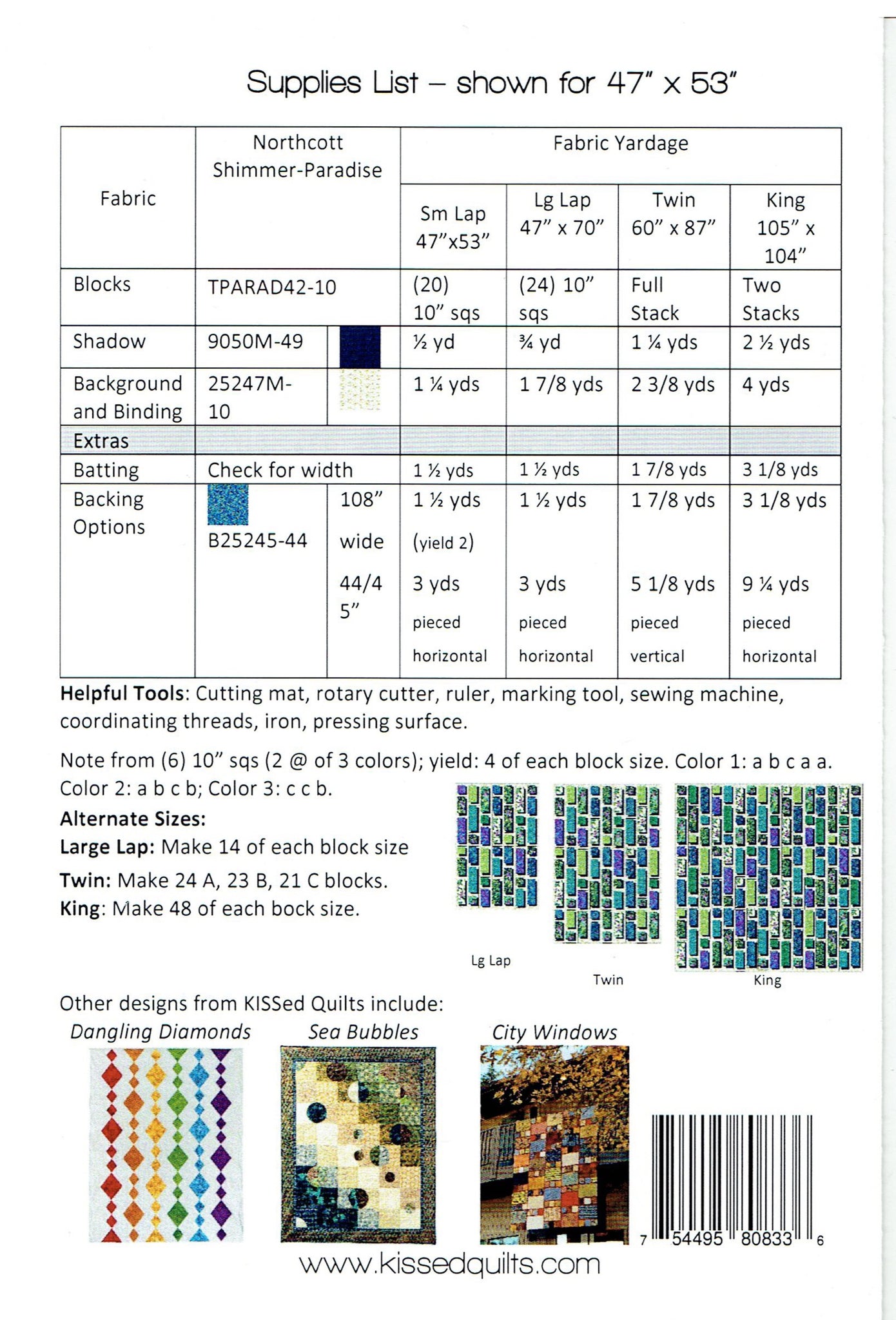 Pattern will make a small lap (47" x 53"), large lap (47" x 70") or twin size (60" x 87"). Two twin kits will make a king size (105" x 104").