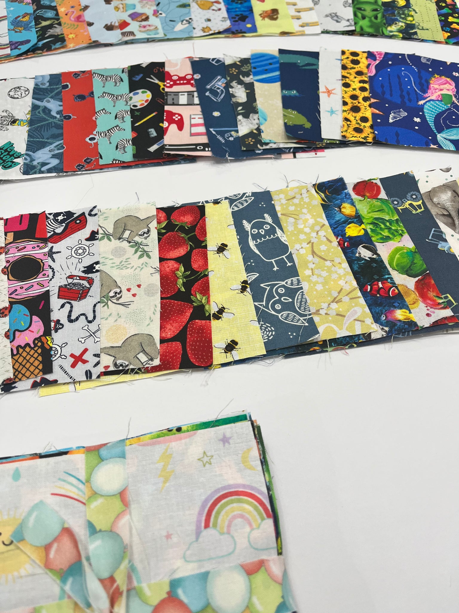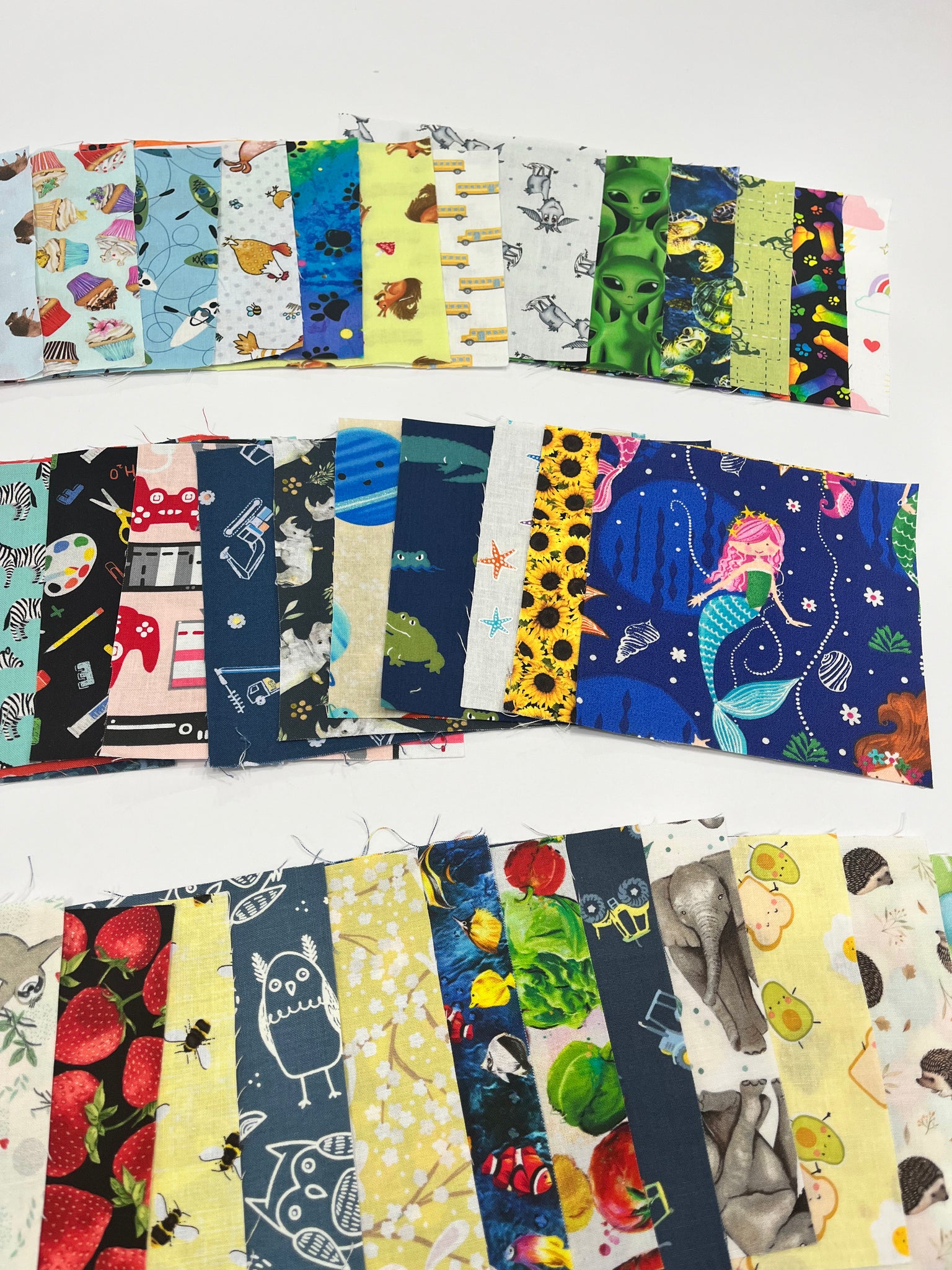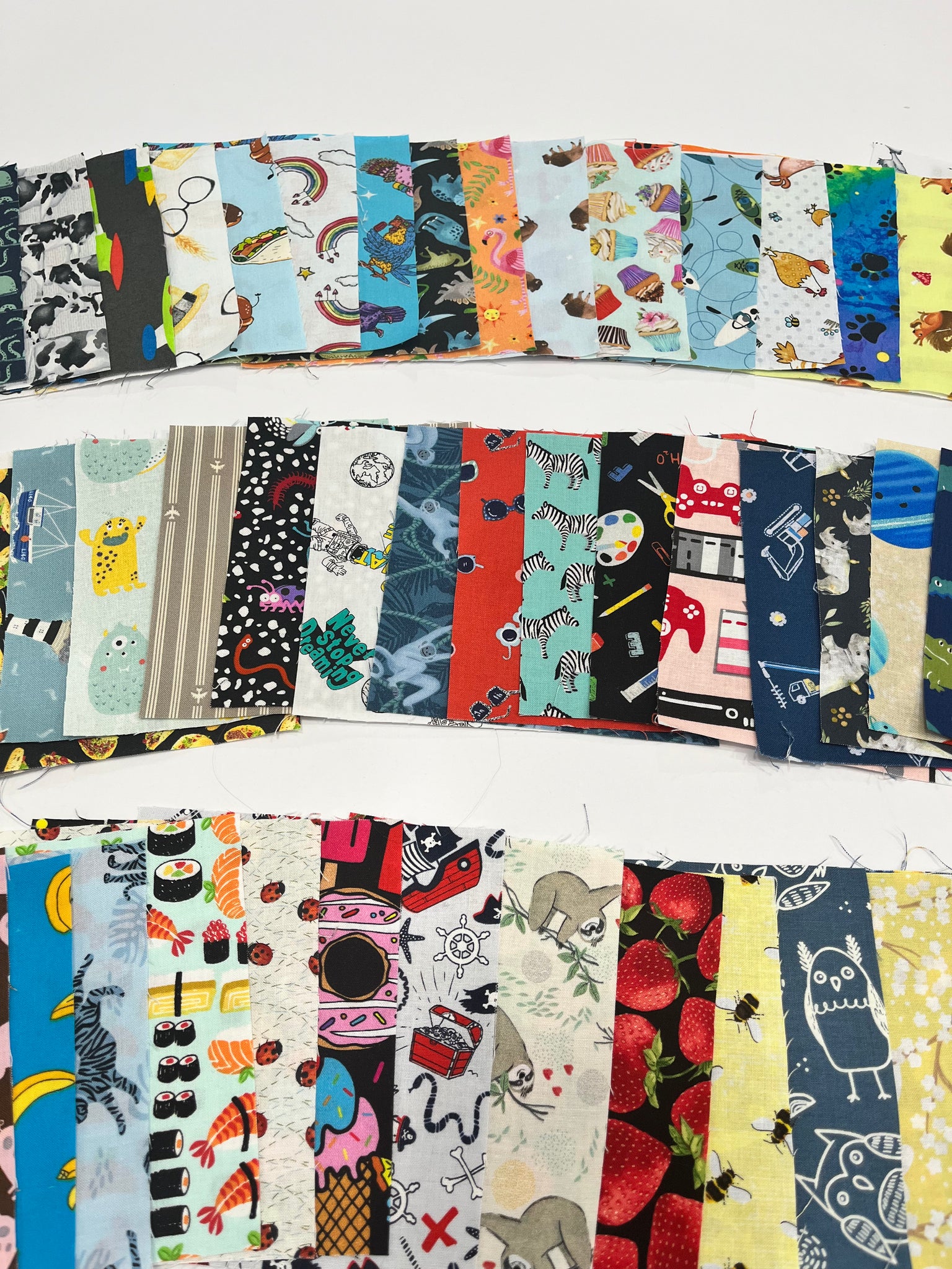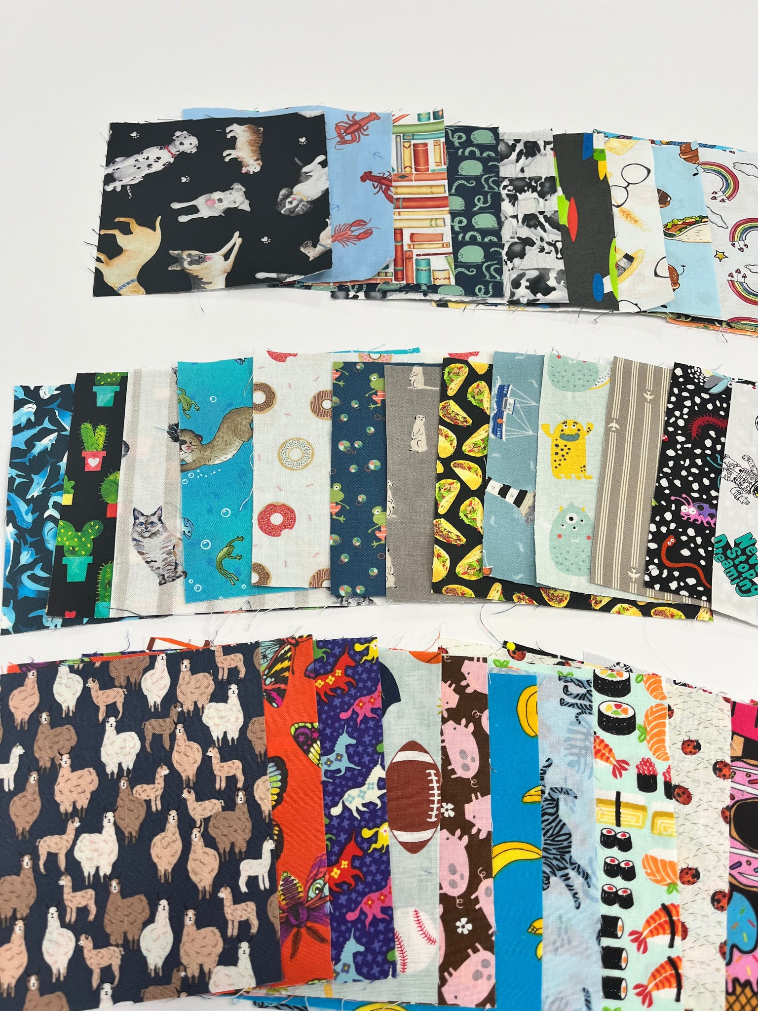 This novelty charm pack consists of 72 (+1 Bonus) 5" squares. You will receive 73 different prints including animals, food, interests and more, perfect for an I-Spy Quilt. There are no duplicates in this pack. All charms are hand cut.