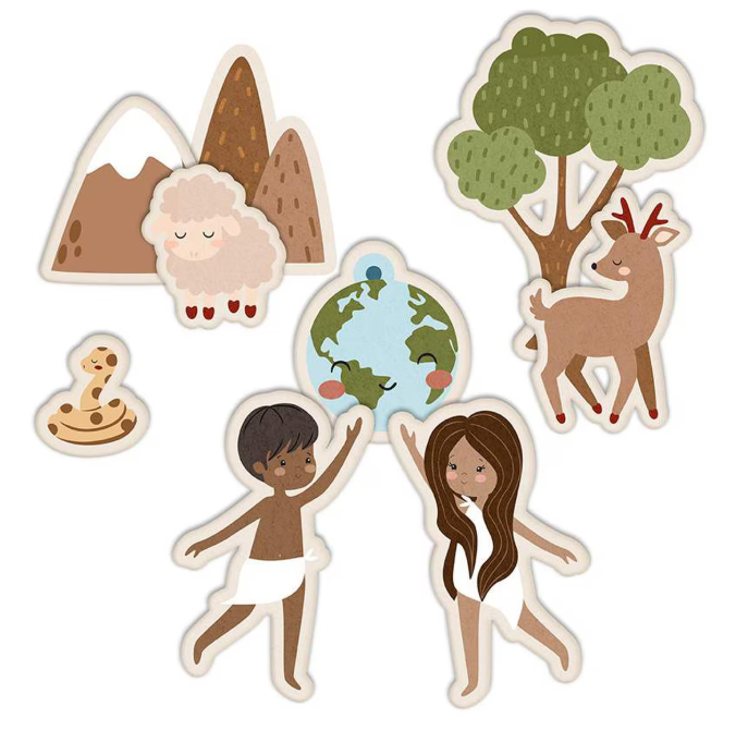 This felt panel features elements from the creation of the earth and pieces to make a tote bag.