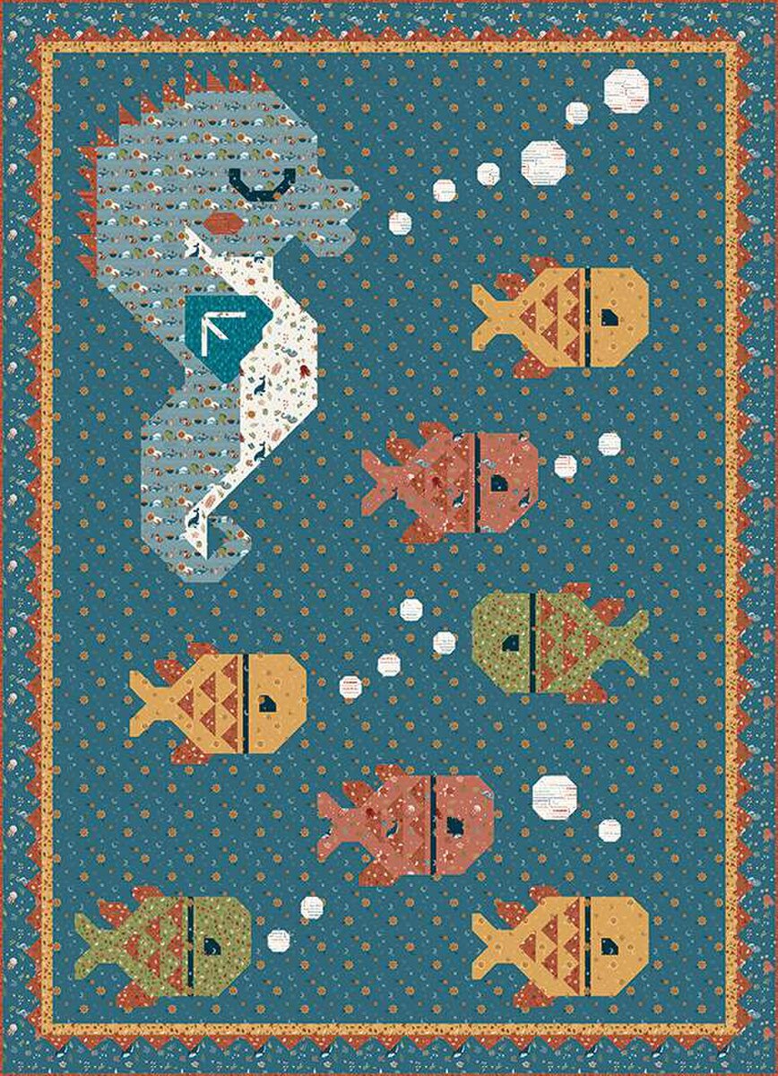 The Seahorse School Quilt by Jennifer Long of Sew A Story showcases a larger-than-life seahorse and a friendly school of fish. Bubbles and prairie point embellishments in the border add engaging touches to the quilt. This confident beginner-level quilt is traditionally pieced.