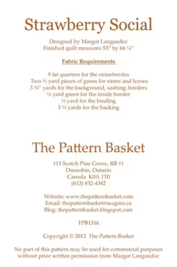 Indulge in the charm of the Strawberry Social quilt, a delightful creation by Margot Languedoc that measures 53 inches by 66-1/4 inches when finished. This quilt features a playful pattern of strawberries in various shades of red and pink, accented with green leaves, set against a soft white background. The design includes a border of green strawberries, adding a fresh touch to the overall look. Perfect for adding a touch of whimsy to any room, this quilt is crafted with care and attention to detail, making it a wonderful addition to both homes and businesses looking for unique, handcrafted decor.