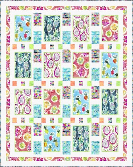 50in x 63in throw and 43in x 19in table runner Use a bunch of prints from a collection or that group of irresistible prints that everyone has on hand, add a couple of basics to tie them all together to make a colorful quilt! Fabrics shown from the Wild & Fruity collection from QT Fabrics. Skill Level: Beginner