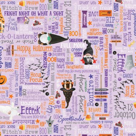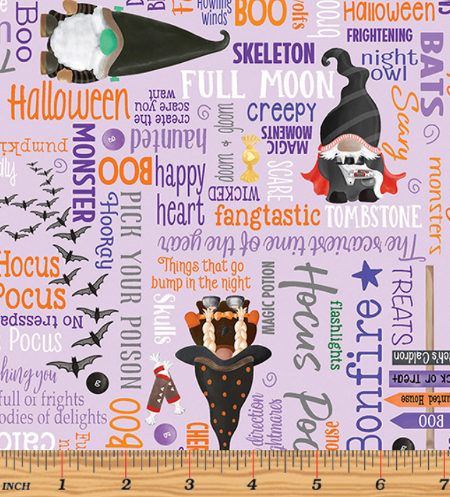 Fun Halloween print with gnomes and Halloween-themed words on a light purple background from the Spooktacular Gnomes collection.