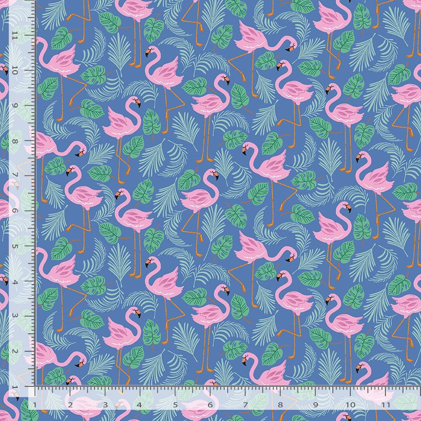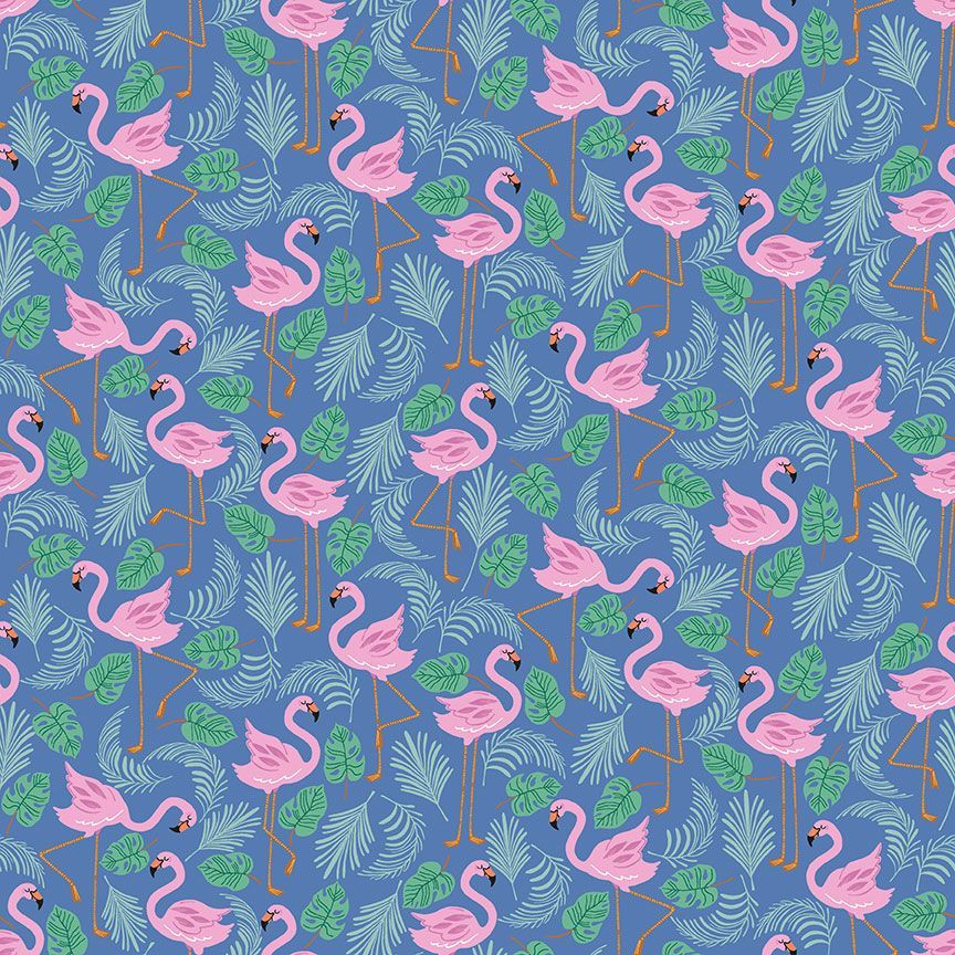 Pink flamingos and tropical foliage on a blue background from the Croc My World collection.