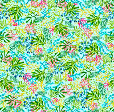 Beautiful floral seaweed fabric on a light blue background from the Blooming Ocean collection.
