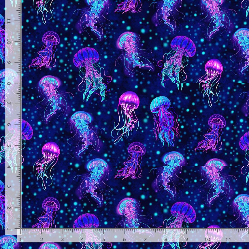 Pretty jellyfish on a dark blue background with bubbles from the Electric Ocean collection.