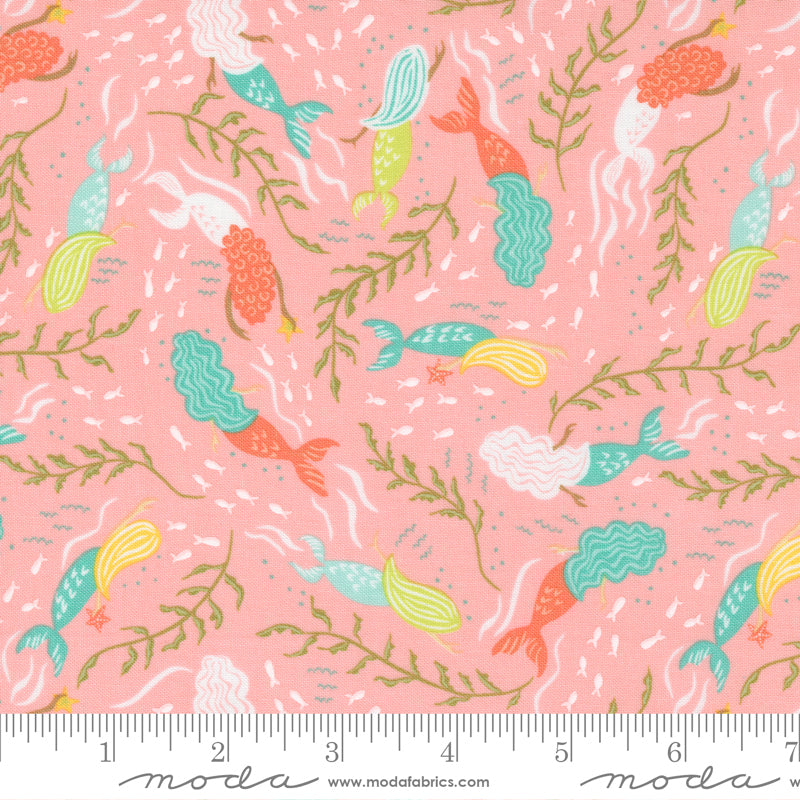 Sweet print with mermaids, kelp and tiny fish on a pink background from the The Sea and Me collection. We have the entire collection in stock!