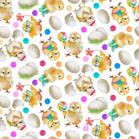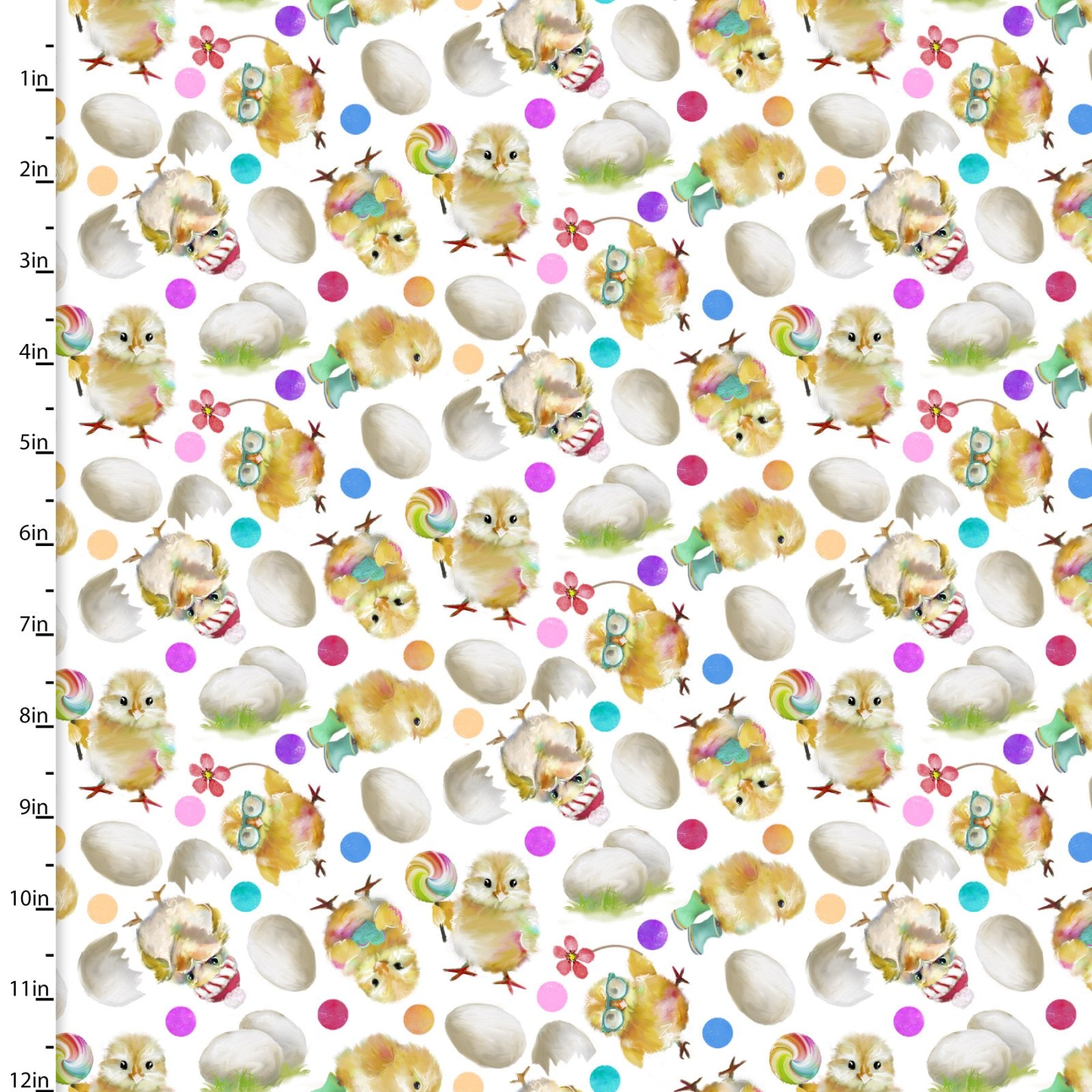 Adorable chicks with glasses and lollipops on a white background with colorful polka dots from the Back to the Farm collection.