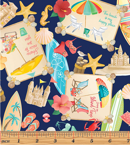 Fun beach print with surfboards, sand castles and more on a dark blue background from the Beach Retreat collection.