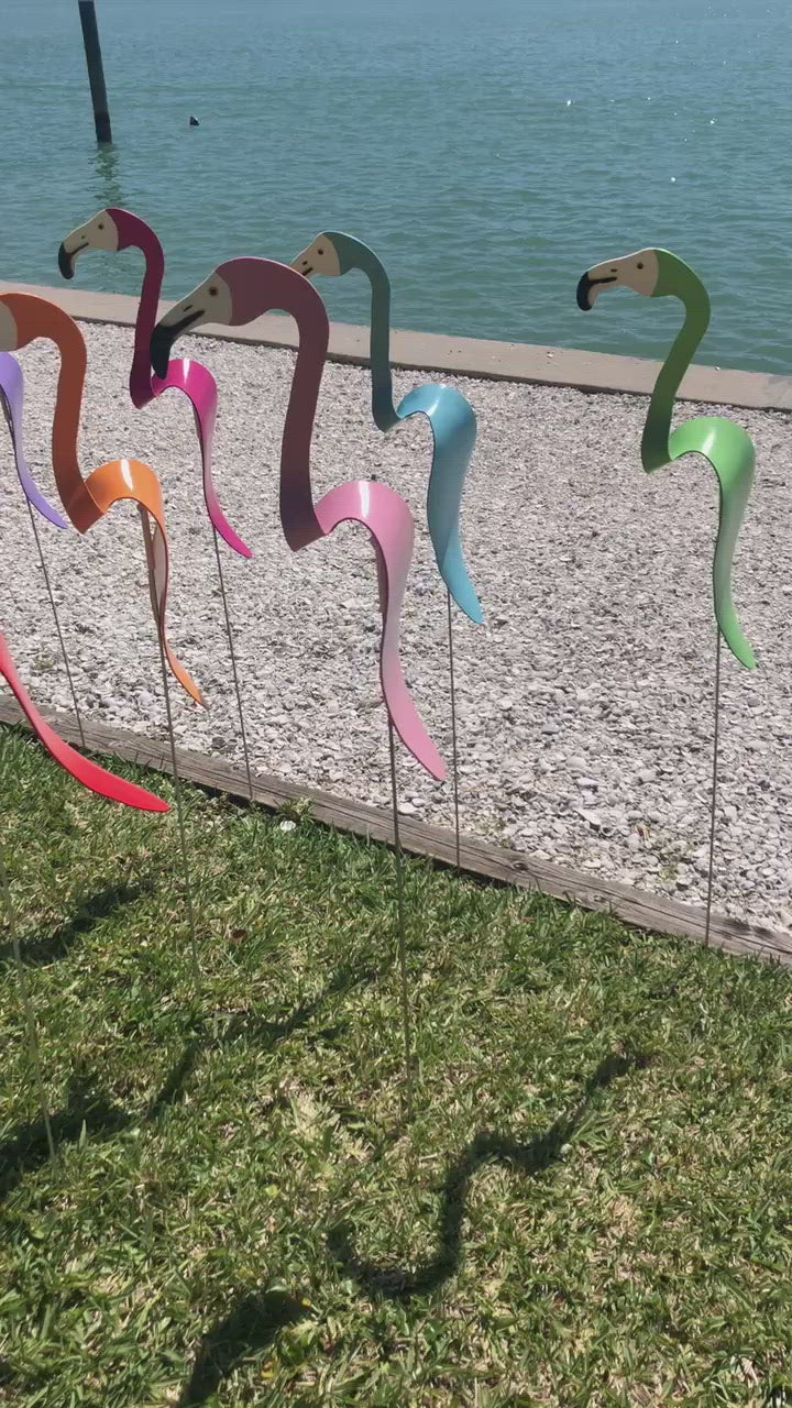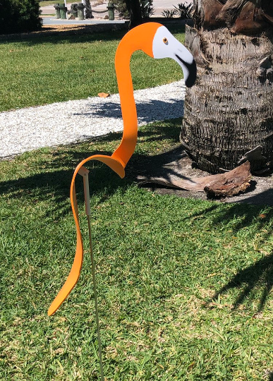 This fun flamingo will make a statement in any yard. Place it in your garden, by the pool or as an accent in a flower bed. They are designed and crafted to dance in the wind. Each bird is hand cut, shaped and painted and comes with a 36" galvanized metal pole. Made out of PVC, these birds won't rust, can withstand heat and cold, and are painted with UV protected paint, so they are fade resistant. You will enjoy this beautiful accent for years to come. The flamingos are available in a variety of colors, so order yourself a flock today!