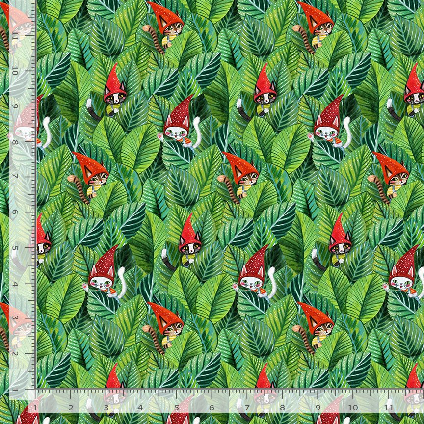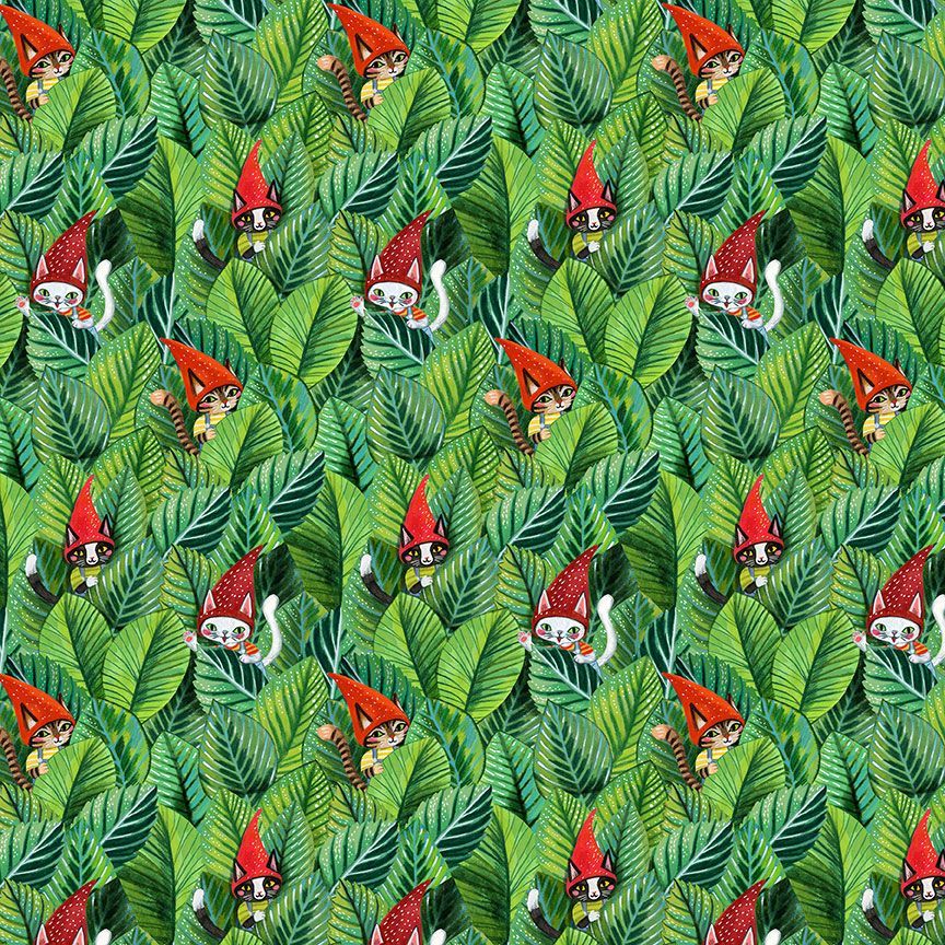 Adorable kitty cat gnomes peaking around green leafy foliage from the Somebunny To Love collection.