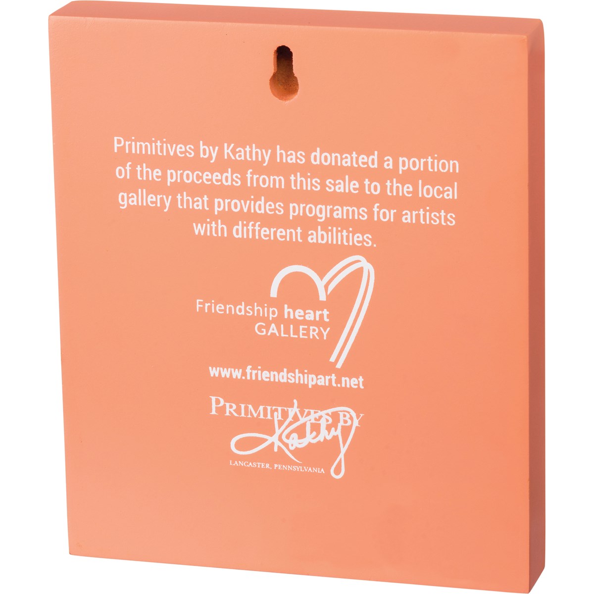 Replicated from original art created at the Friendship Heart Gallery in downtown Lancaster, PA by artists with intellectual disabilities and autism, this wooden box sign features flamingo design. Hangs easily by predrilled keyhole slot or can free-stand alone.