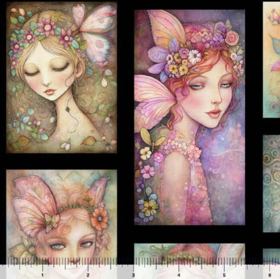 Fantastical print with fairies edged by black boxes from the Enchanted collection.
