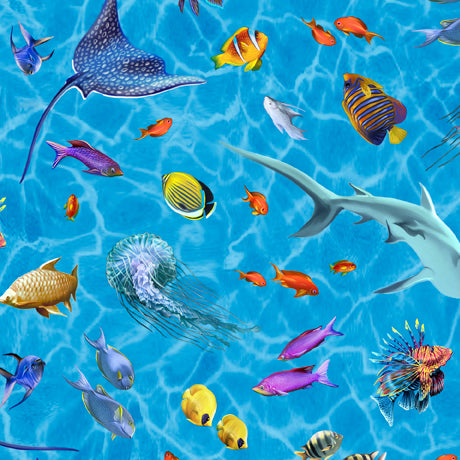 Realistic underwater print with sharks, rays and fish on a watery blue background from the Treasures at Sea collection.