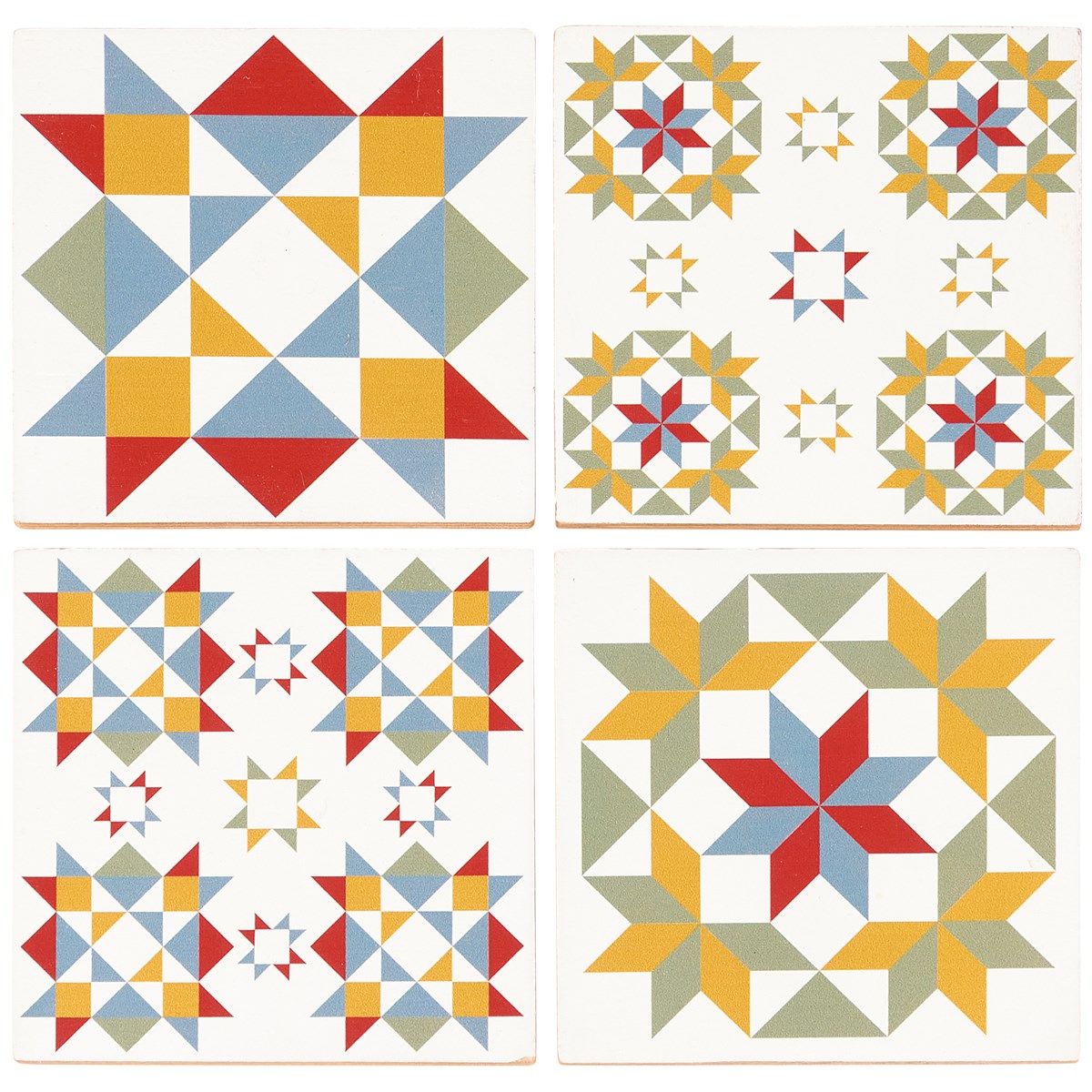 A coordinating set of four wooden coasters displaying unique hand illustrated star designs inspired by quilt patterns. Each coaster features individual star quilt designs replicated from original hand illustrated art.