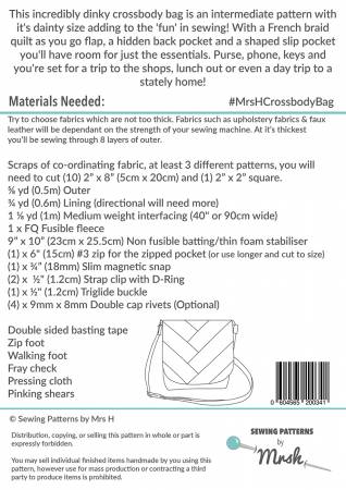 This incredibly chic Crossbody Bag is an intermediate level bag sewing pattern, with its dainty size adding to the fun of sewing! Featuring a French Braid quilt as you go flap, a hidden back pocket, and a shaped slip pocket, you'll have room for just the essentials. Dimensions 6 1/2" Width x 8" Height x 3" Depth (16.5cm x 20.5cm x 7.5cm)